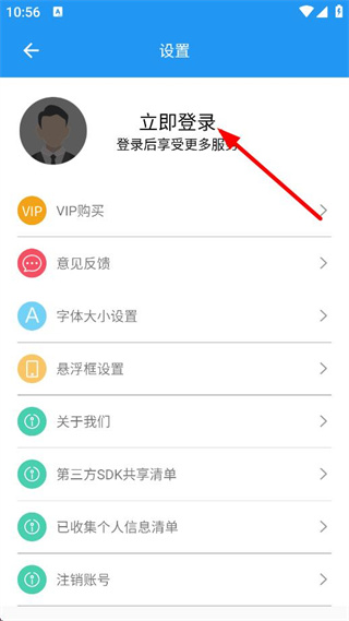 2、在设置页面,点击立即登录,进入账号登录页面。