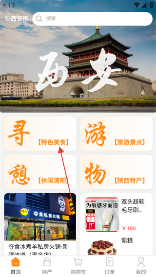 1、进入春安美食首页,点击寻特色美食,进入特色美食推荐页面。
