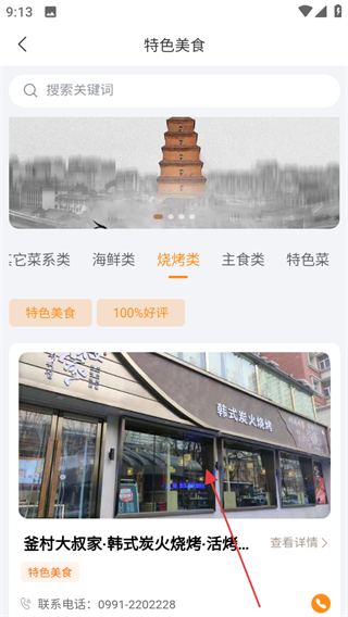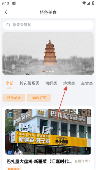 2、在特色美食页面,点击烧烤类标签,可查看烧烤类美食店铺推荐。