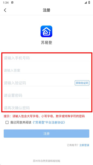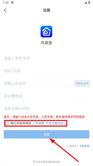 4、勾选我已同意并阅读苏易登平台注册协议,点击注册按钮即可完成账号注册。