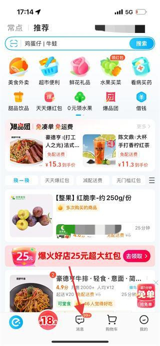 1、进入饿了么首页,点击消息,进入消息中心页面。
