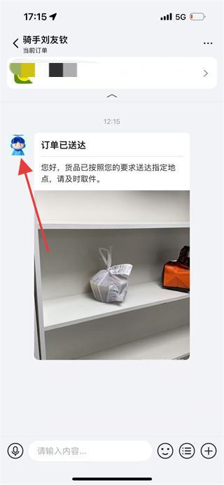 3、在聊天页面,可查看订单送达信息,点击骑手头像进入骑手详情页面。