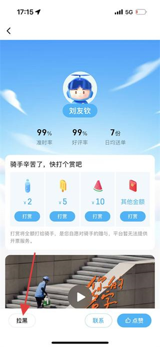4、点击拉黑即可成功拉黑骑手,拉黑后这个骑手就不会给你配送了。