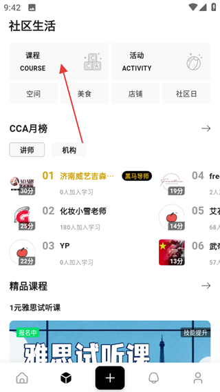 2、在社区生活页面,点击课程可进入课程相关板块。