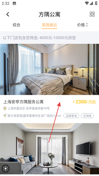 3、在筛选结果中,点击心仪房源如上海安亭方隅服务公寓可进入房源详情页。