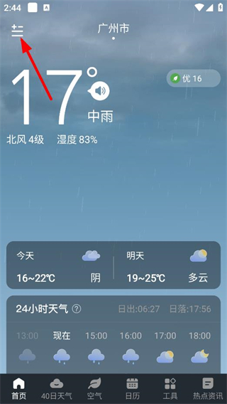 1、在APP主页面,点击左上角菜单图标,进入城市列表页面。