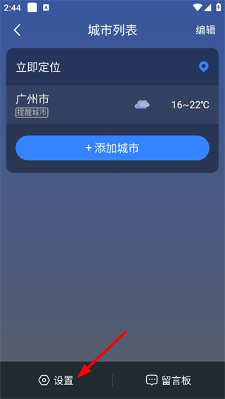 2、在城市列表页面,点击底部设置,进入设置页面。