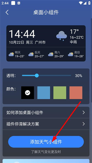 4、在桌面小组件页面,点击添加天气小组件,可将天气小组件添加到手机桌面。