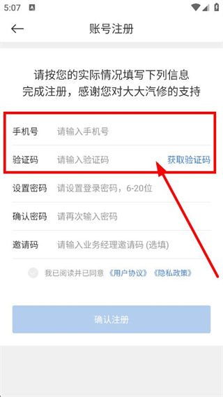 3、在账号注册页面,输入手机号,点击获取验证码,输入验证码。