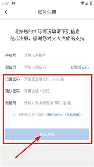 4、在账号注册页面,设置密码、确认密码,点击确认注册,完成账号注册。