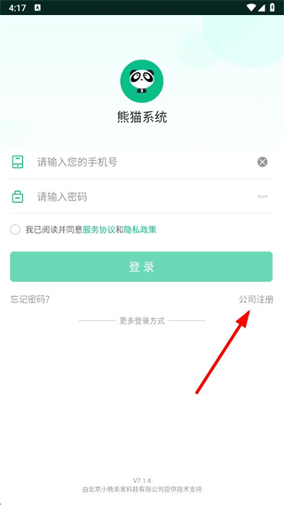 1、在熊猫系统登录界面,找到公司注册选项并点击进入注册流程。