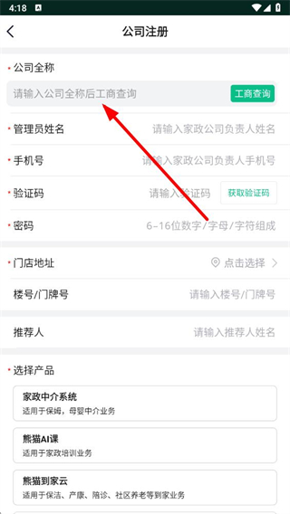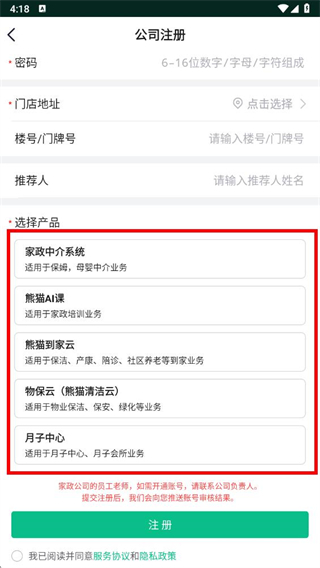 3、在公司注册的选择产品环节,根据业务需求从家政中介系统熊猫AI课熊猫到家云等产品中选择对应的业务系统。