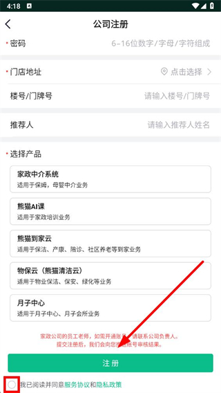 4、勾选我已阅读并同意服务协议和隐私政策,然后点击注册按钮提交公司注册信息。