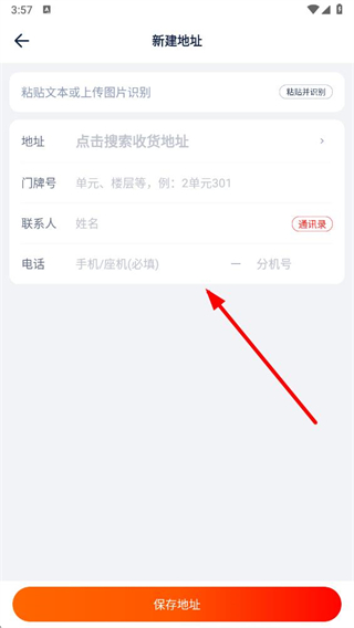 4、在新建地址页面填写地址、门牌号、联系人、电话等信息后,点击保存地址按钮,即可完成地址添加。