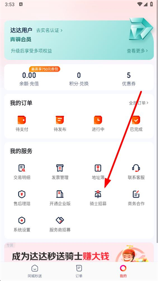 2、在个人页面点击骑士招募选项,进入成为京东秒送骑手页面。