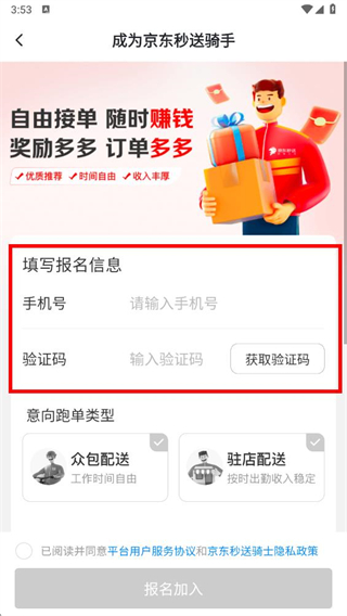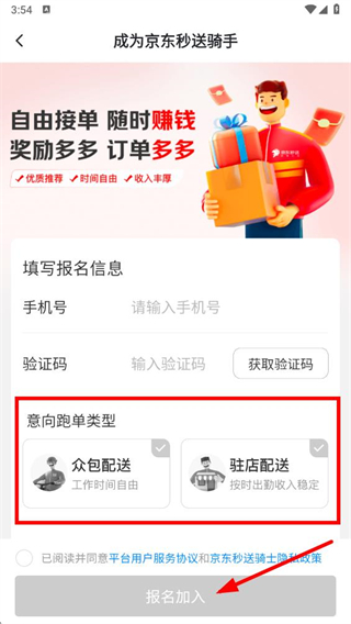 4、选择意向跑单类型,勾选已阅读并同意相关协议后,点击报名加入按钮,即可完成骑士注册。
