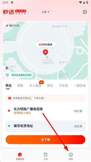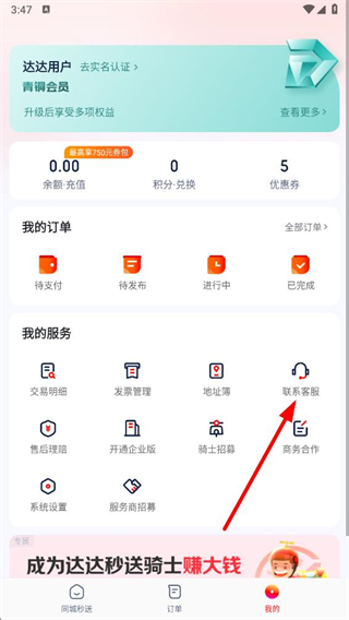 1、打开达达秒送app,点击右下角我的选项,进入个人页面。