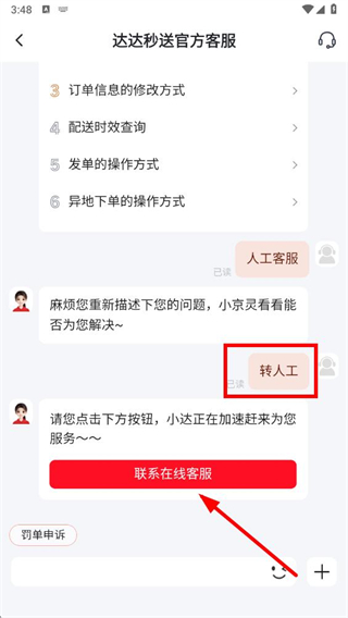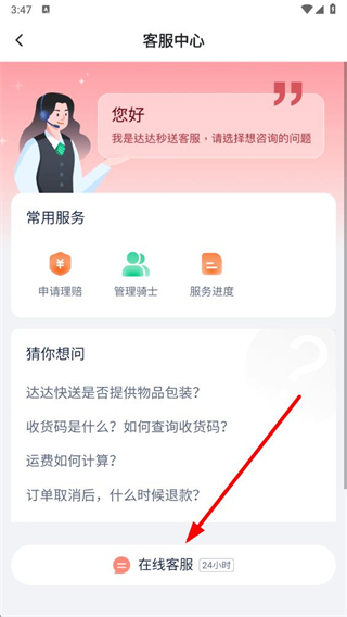 3、在客服中心页面点击在线客服按钮,进入达达秒送官方客服对话页面。