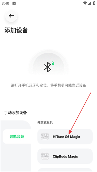 2、在添加设备页面,可选择手动添加设备如HiTuneS6Magic。