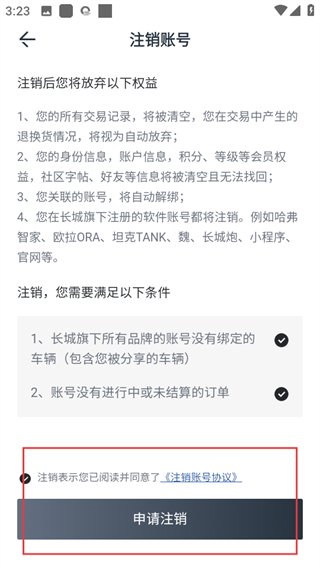5、在注销账号页面,勾选同意协议后点击【申请注销】可完成账号注销。