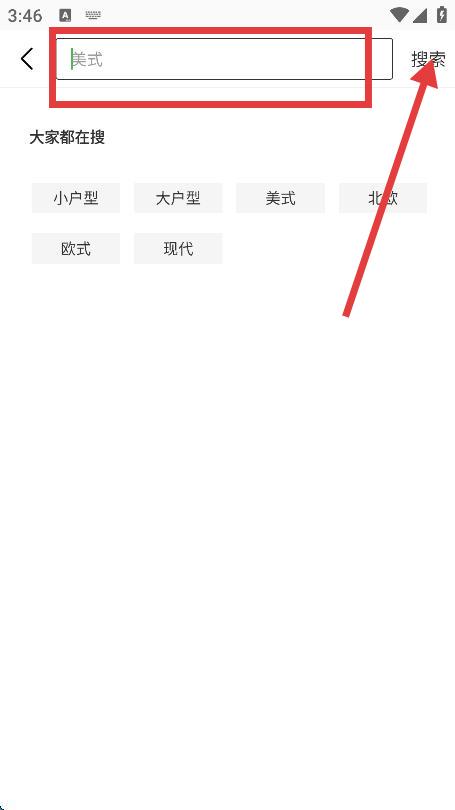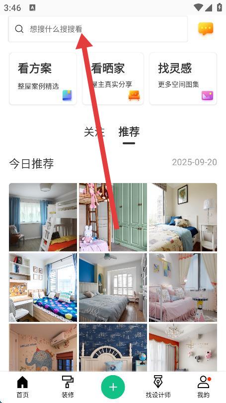 1、打开最美装修app,在首页点击顶部的搜索框。