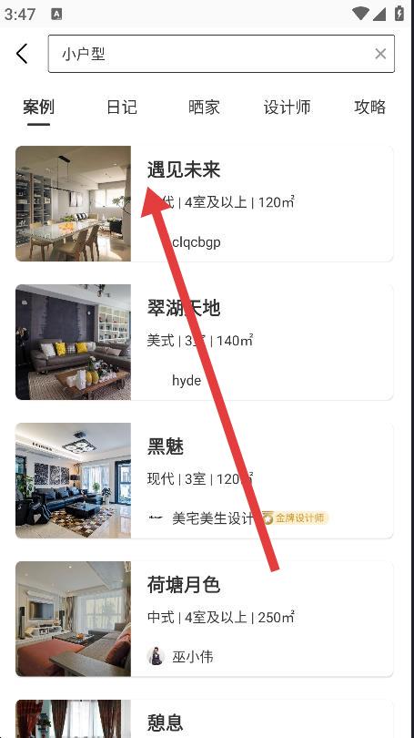 3、在搜索结果页面,浏览并点击感兴趣的装修案例。