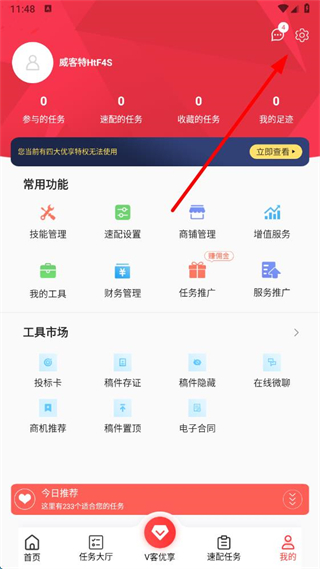 1、在一品接单app个人页面点击右上角设置图标,进入设置页面。