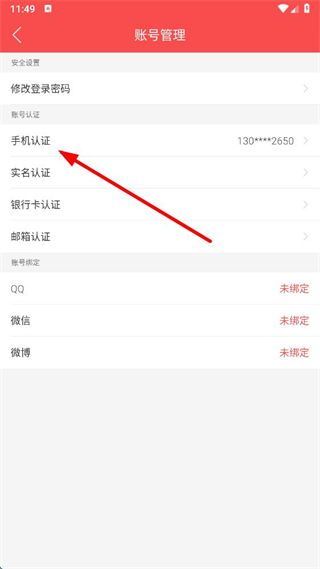 3、在账号管理页面点击手机认证选项,进入手机认证页面。