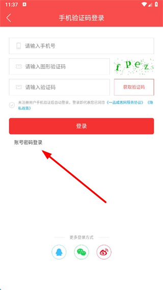 2、在登录页面点击账号密码登录选项,切换到账号密码登录页面。