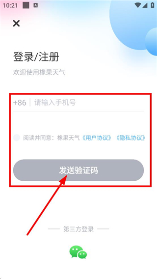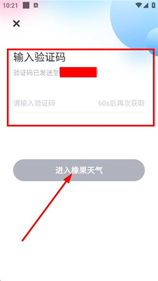 4、输入收到的验证码后,点击进入橡果天气,完成账号登录。