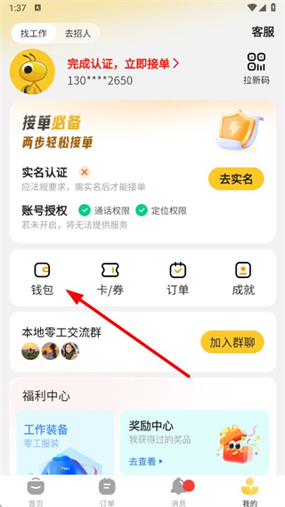 1、在找零工app个人页面点击钱包选项,进入我的钱包页面。