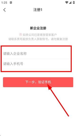 2、输入企业名称、手机号后,点击下一步,验证手机,进入验证手机号页面。