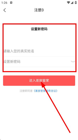 4、在设置新密码页面,输入真实姓名、设置新密码后,点击进入差旅管家,完成新企业注册。