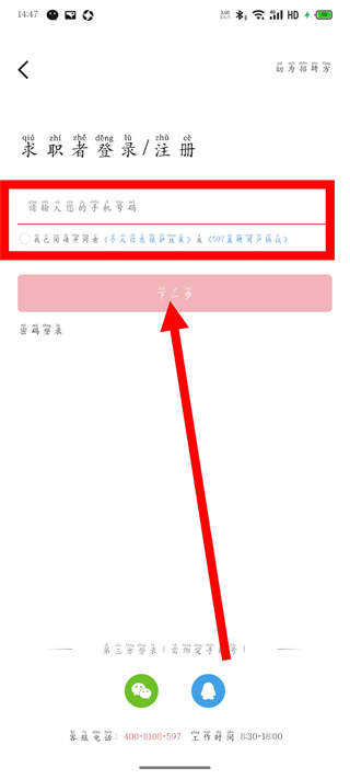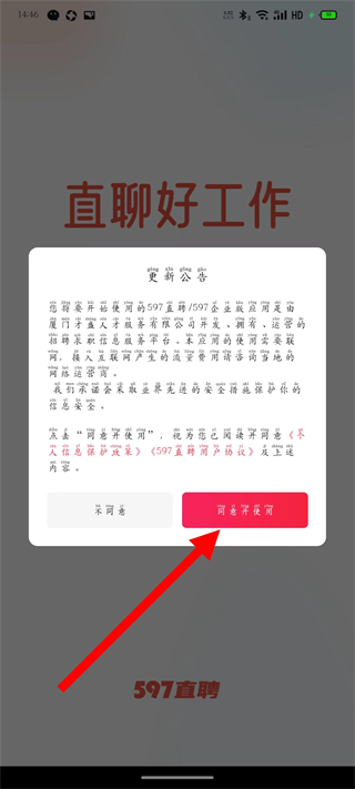 1、打开597直聘,在弹窗中,点击同意并使用,进入身份选择页面。