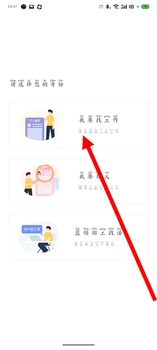 2、在身份选择页面,点击我要找工作选项,进入求职者登录注册界面。