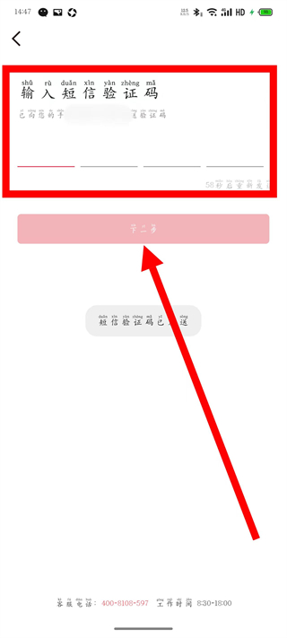 4、在输入短信验证码页面,输入收到的验证码后,完成账号注册。