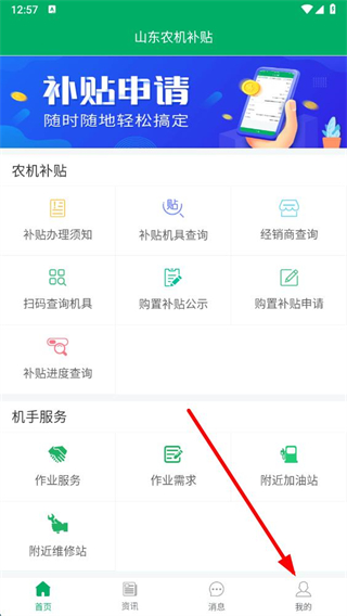 1、在山东农机补贴app首页点击我的选项,进入个人页面。