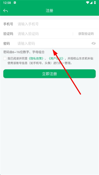 4、在注册页面输入手机号、验证码和密码,勾选同意相关协议后点击“立即注册”按钮,完成注册操作。
