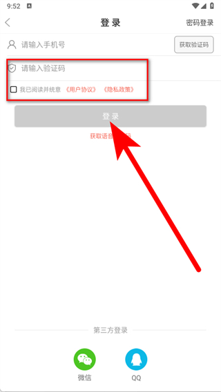 4、输入收到的验证码,勾选后,点击登录,完成账号登录。