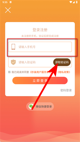 3、在登录注册页面,输入手机号,点击获取验证码。
