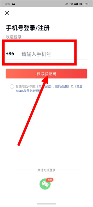 3、在登录界面,输入手机号码后,点击获取验证码按钮。