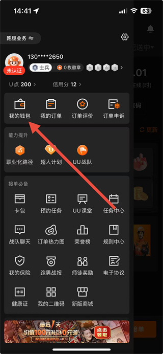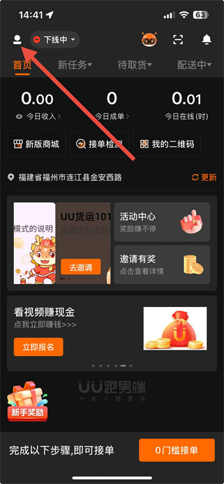 1、在UU跑腿跑男端首页点击左上角头像区域,进入个人功能页面。
