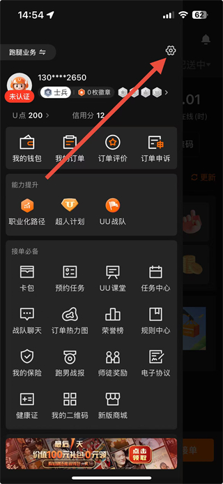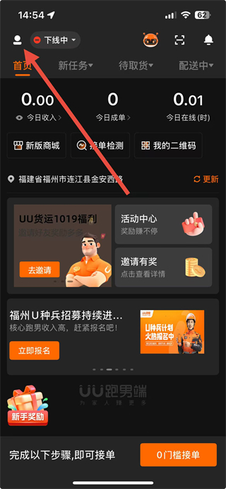 1、在UU跑腿跑男端首页点击左上角头像区域,进入个人功能页面。