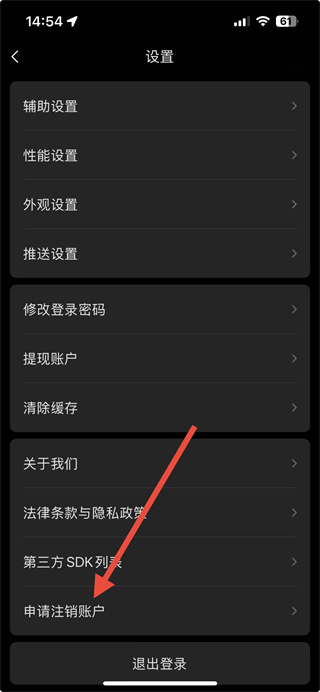 3、在设置页面点击申请注销账户选项,进入账号注销说明页面。