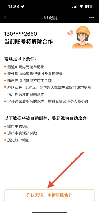 4、在账号注销说明页面点击确认无误,申请解除合作按钮,按提示完成账号注销流程。