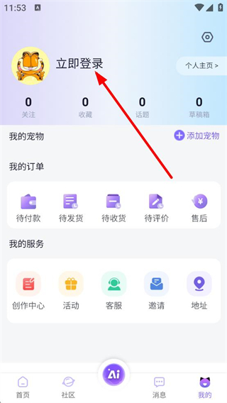 1、在艾宠易首页,点击底部的我的,进入个人中心页面。