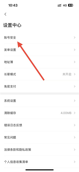 3、在设置中心页面点击账号安全选项,进入账户安全页面。