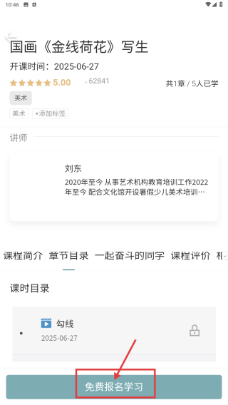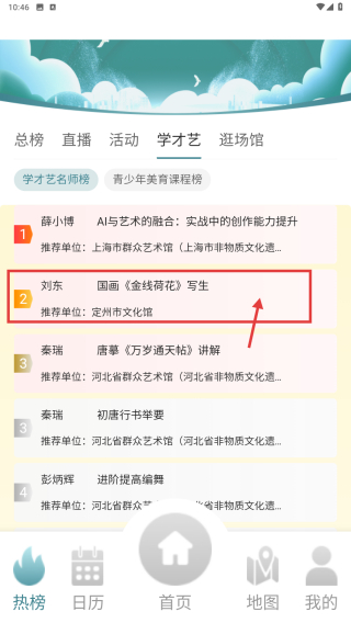 3、在学才艺课程列表里,找到国画金线荷花写生课程条目,点击进入课程详情页。