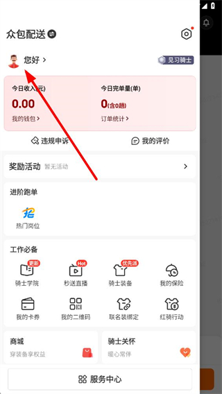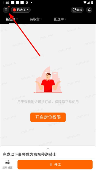 1、在京东秒送骑士app页面点击左上角菜单按钮,展开功能列表。