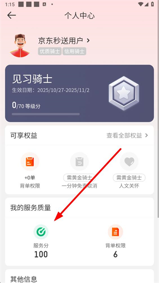 3、在个人中心页面点击服务分选项,进入服务分明细页面。